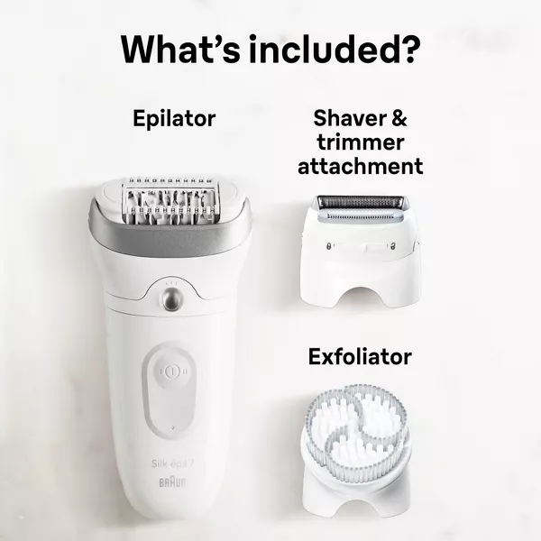 • INCLUDES: SE7 Epilator, Shaver Head, Trimmer comb, Exfoliator, Skin Contact Cap, and Cleaning Brush