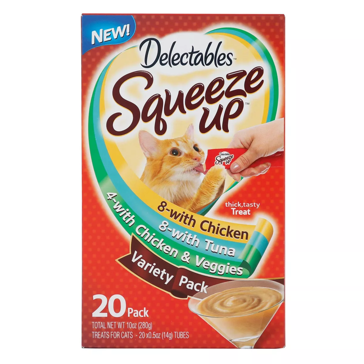 Squeeze up some fun with Delectables Squeeze Up interactive wet cat treats, taking treat time to a whole new level (or, giving treat time a whole new meaning!) Each .5 ounce lickable tube is stuffed with a rich and thick creamy puree in lip-smacking flavors.